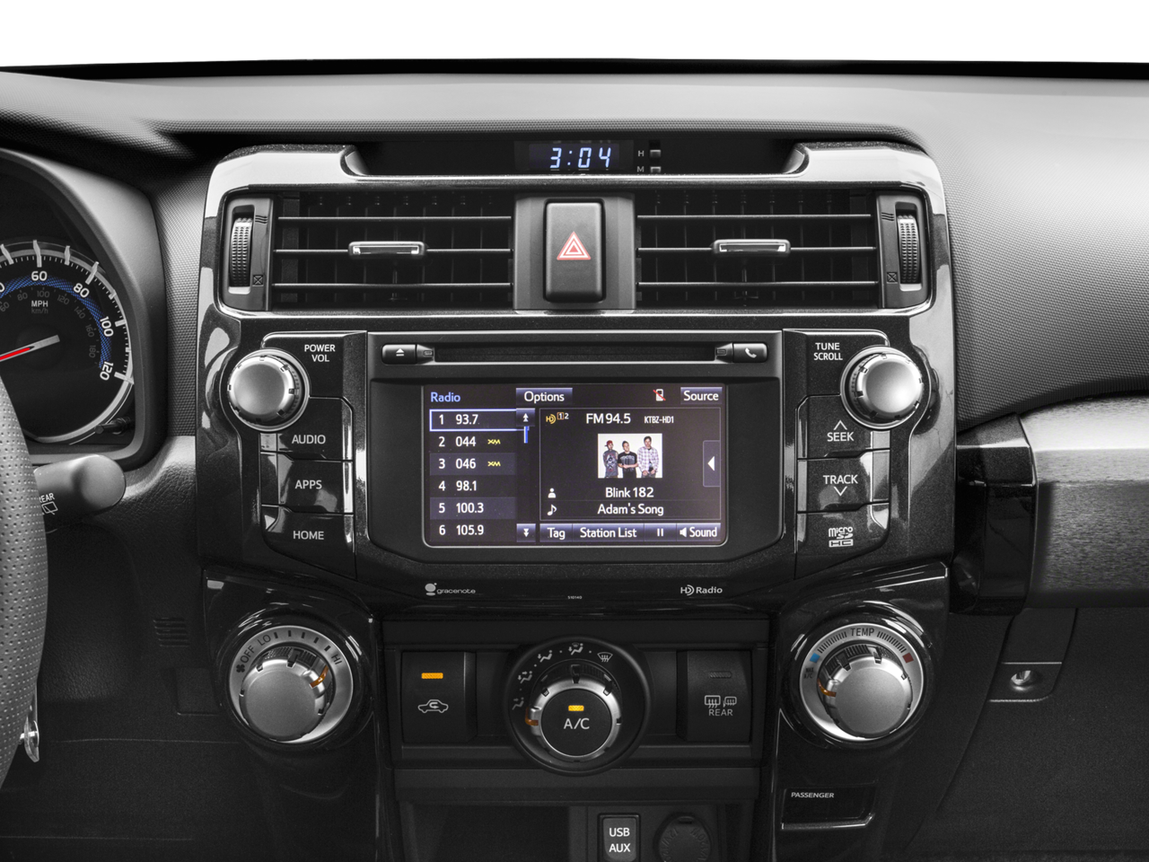 4WD, Cloth, 3.727 Axle Ratio, 4-Wheel Disc Brakes, 8 Speakers, ABS brakes, Air Conditioning, Alloy wheels, AM/FM radio: SiriusXM, Anti-whiplash front head restraints, Black Roof Rails, Brake assist, Bumpers: body-color, CD player, Compass, Driver door bin, Driver vanity mirror, Dual front impact airbags, Dual front side impact airbags, Electronic Stability Control, Emergency communication system: Safety Connect, Exterior Parking Camera Rear, Fabric Seat Trim, Front anti-roll bar, Front Bucket Seats, Front Center Armrest, Front fog lights, Front reading lights, Front wheel independent suspension, Heated door mirrors, Illuminated entry, Knee airbag, Leather Shift Knob, Low tire pressure warning, Occupant sensing airbag, Outside temperature display, Overhead airbag, Overhead console, Panic alarm, Passenger door bin, Passenger vanity mirror, Power door mirrors, Power driver seat, Power steering, Power windows, Radio: Entune Audio Plus, Rear anti-roll bar, Rear seat center armrest, Rear window defroster, Rear window wiper, Remote keyless entry, Roof rack: rails only, Security system, Speed control, Speed-sensing steering, Split folding rear seat, Spoiler, Steering wheel mounted audio controls, Tachometer, Telescoping steering wheel, Tilt steering wheel, Traction control, Trip computer, Variably intermittent wipers, Wheels: 17 x 7.5 7-Spoke Unique Off-Road Alloy, 4WD, Cloth.