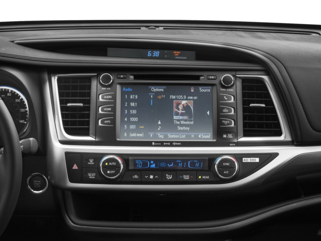3rd row seats: split-bench, 4-Wheel Disc Brakes, 6 Speakers, ABS brakes, Air Conditioning, Alloy wheels, AM/FM radio: SiriusXM, Auto High-beam Headlights, Auto-dimming Rear-View mirror, Automatic temperature control, Black Roof Rails, Brake assist, Bumpers: body-color, CD player, Delay-off headlights, Driver door bin, Driver vanity mirror, Dual front impact airbags, Dual front side impact airbags, Electronic Stability Control, Exterior Parking Camera Rear, Four wheel independent suspension, Front anti-roll bar, Front Bucket Seats, Front Center Armrest, Front dual zone A/C, Front fog lights, Front reading lights, Fully automatic headlights, Garage door transmitter, Heated door mirrors, Heated front seats, Illuminated entry, Knee airbag, Leather Seat Trim, Leather Shift Knob, Low tire pressure warning, Navigation System, Occupant sensing airbag, Outside temperature display, Overhead airbag, Overhead console, Panic alarm, Passenger door bin, Passenger vanity mirror, Power door mirrors, Power driver seat, Power Liftgate, Power moonroof, Power passenger seat, Power steering, Power windows, Radio: Entune Premium Audio w/Nav & App Suite, Rear air conditioning, Rear anti-roll bar, Rear reading lights, Rear window defroster, Rear window wiper, Reclining 3rd row seat, Remote keyless entry, Roof rack: rails only, Security system, Speed control, Speed-sensing steering, Split folding rear seat, Spoiler, Steering wheel mounted audio controls, Tachometer, Telescoping steering wheel, Tilt steering wheel, Traction control, Trip computer, Turn signal indicator mirrors, Variably intermittent wipers, Wheels: 19 Multi-Spoke Machined-Face Alloy.