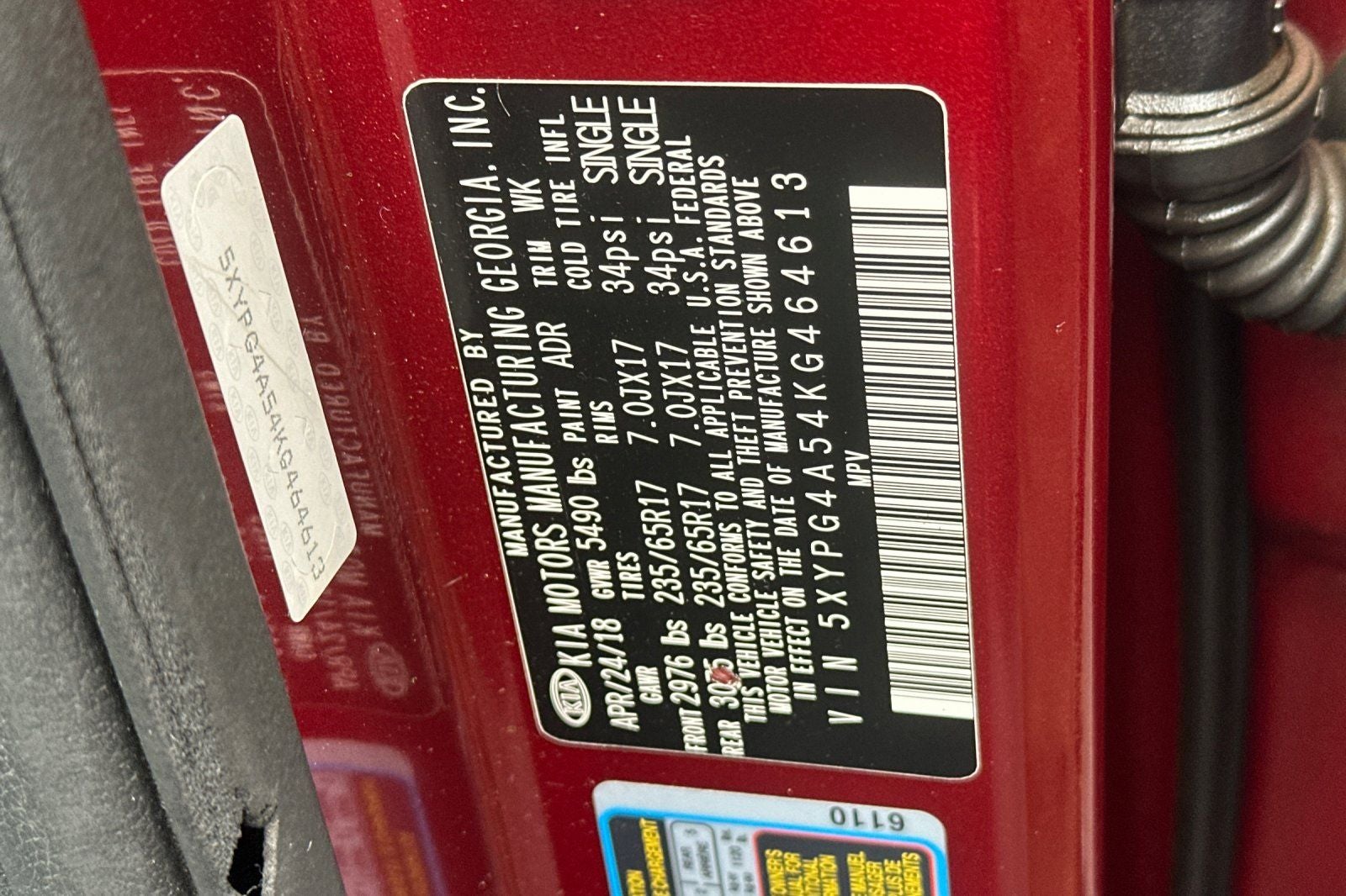 17 x 7.0 Alloy Wheels, 3.32 Axle Ratio, 3rd row seats: split-bench, 4-Wheel Disc Brakes, 6 Speakers, ABS brakes, Air Conditioning, Alloy wheels, AM/FM radio, Apple CarPlay & Android Auto, Automatic temperature control, Brake assist, Bumpers: body-color, Carpeted Floor Mats (7-Passenger), Delay-off headlights, Driver door bin, Driver vanity mirror, Dual front impact airbags, Dual front side impact airbags, Electronic Stability Control, Exterior Parking Camera Rear, Four wheel independent suspension, Front anti-roll bar, Front Bucket Seats, Front Center Armrest, Front dual zone A/C, Front reading lights, Fully automatic headlights, Heated door mirrors, Illuminated entry, Low tire pressure warning, Occupant sensing airbag, Outside temperature display, Overhead airbag, Overhead console, Panic alarm, Passenger door bin, Passenger vanity mirror, Power door mirrors, Power driver seat, Power steering, Power windows, Radio data system, Radio: UVO Play w/AM/FM/MP3, Rear anti-roll bar, Rear seat center armrest, Rear window defroster, Rear window wiper, Remote keyless entry, Security system, Speed control, Speed-sensing steering, Split folding rear seat, Spoiler, Steering wheel mounted audio controls, Tachometer, Telescoping steering wheel, Tilt steering wheel, Traction control, Trip computer, Turn signal indicator mirrors, Variably intermittent wipers, YES Essentials Cloth Seat Trim.