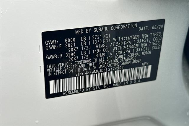 3rd row seats: bench, 3rd Row Sunshade, 4-Wheel Disc Brakes, 6 Speakers, ABS brakes, Air Conditioning, All-Weather Floor Liners, Alloy wheels, AM/FM radio: SiriusXM, Auto High-beam Headlights, Auto-Dimming Exterior Mirror w/Approach Light, Auto-dimming Rear-View mirror, Automatic temperature control, Axle Ratio: 4.44, Brake assist, Bumpers: body-color, Cargo Net, Cargo Tray, CD player, Compass, Crystal White Pearl Body Side Molding, Delay-off headlights, Driver door bin, Driver vanity mirror, Dual front impact airbags, Dual front side impact airbags, Electronic Stability Control, Emergency communication system: STARLINK Safety and Security (Subscription Required), Exterior Parking Camera Rear, Four wheel independent suspension, Front anti-roll bar, Front Bucket Seats, Front Center Armrest, Front dual zone A/C, Front fog lights, Front reading lights, Fully automatic headlights, Garage door transmitter: HomeLink, Heated door mirrors, Heated Front Bucket Seats, Heated front seats, Heated rear seats, Heated steering wheel, Illuminated entry, Knee airbag, Low tire pressure warning, Memory seat, Occupant sensing airbag, Outside temperature display, Overhead airbag, Overhead console, Panic alarm, Passenger door bin, Passenger vanity mirror, Perforated Leather-Trimmed Upholstery, Popular Package #2, Power door mirrors, Power driver seat, Power Liftgate, Power passenger seat, Power steering, Power windows, Radio data system, Radio: Subaru STARLINK 8.0 Multimedia Plus System, Rear air conditioning, Rear anti-roll bar, Rear Bumper Cover, Rear reading lights, Rear seat center armrest, Rear Seatback Protector, Rear window defroster, Rear window wiper, Reclining 3rd row seat, Remote keyless entry, Security system, Speed control, Splash Guards, Split folding rear seat, Spoiler, Standard Model, STARLINK/Apple CarPlay/Android Auto, Steering wheel mounted audio controls, Tachometer, Telescoping steering wheel, Tilt steering wheel, Traction control, Trip computer, Turn signal indicator mirrors, USB Charging Ports, Variably intermittent wipers, Wheels: 20 Dk Gray Aluminum Alloy w/Machine Finish, Windshield Sunshade.