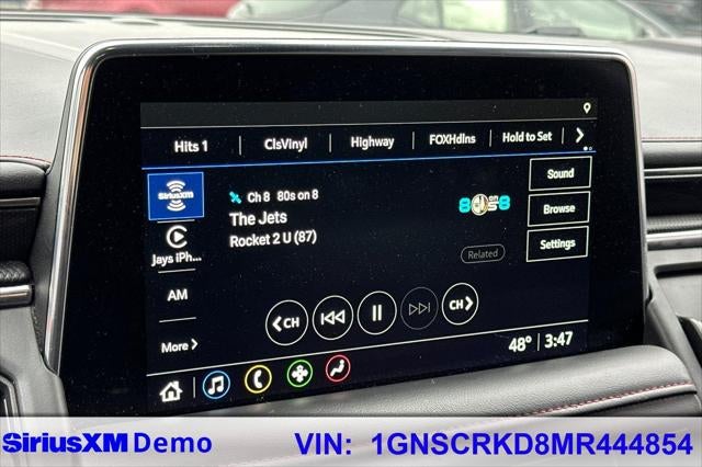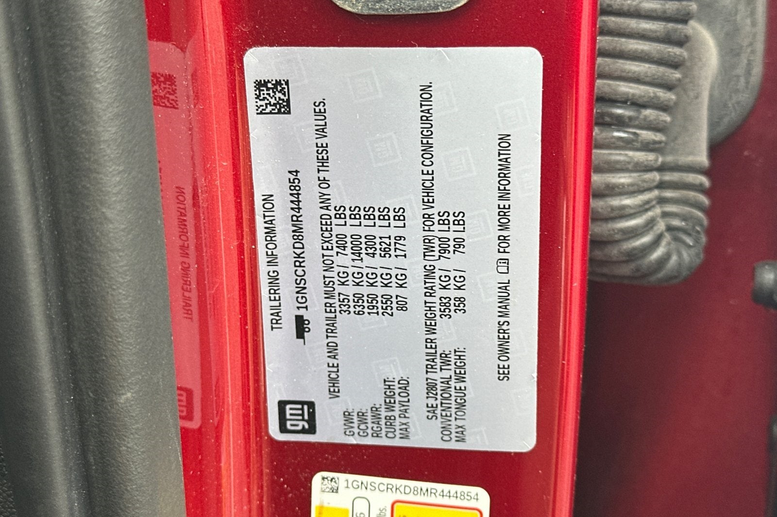 Jet Black/Victory Red Leather, 10-Way Power Driver & Passenger Seat Adjusters, 1st & 2nd Row Color-Keyed Carpeted Floor Mats, 2 USB Data Ports, 3.23 Rear Axle Ratio, 3rd row seats: split-bench, 4-Wheel Disc Brakes, 9 Speakers, ABS brakes, Air Conditioning, Alloy wheels, AM/FM radio: SiriusXM with 360L, Apple CarPlay/Android Auto, Auto High-beam Headlights, Auto-Dimming Inside Rear-View Mirror, Auto-dimming Rear-View mirror, Automatic temperature control, Bose 9-Speaker Stereo Audio System Feature, Brake assist, Bright Front & Rear Door Sill Plates, Bumpers: body-color, Color-Keyed Carpeting Floor Covering, Compass, Delay-off headlights, Driver & Front Outboard Passenger Airbags, Driver door bin, Driver vanity mirror, Dual front impact airbags, Dual front side impact airbags, Electronic Stability Control, Emergency communication system: OnStar and Chevrolet connected services capable, Floor Console w/Storage Area, Four wheel independent suspension, Front anti-roll bar, Front Bucket Seats, Front Center Armrest, Front dual zone A/C, Front High-Back Reclining Bucket Seats, Front reading lights, Fully automatic headlights, Garage door transmitter, Hands-Free Rear Power Programmable Liftgate, HD Radio, Heated door mirrors, Heated Driver & Front Passenger Seats, Heated front seats, Illuminated entry, Infotainment Display, Leather steering wheel, Leather-Wrapped Steering Wheel, LED Daytime Running Lamps, License Plate Front Mounting Package, Low tire pressure warning, Memory seat, Memory Settings for Driver, Not Equipped w/Automatic Stop/Start, Not Equipped w/Steering Column Lock, Not Equipped w/Wireless Charging, Occupant sensing airbag, Outside temperature display, Overhead airbag, Overhead console, Panic alarm, Passenger door bin, Passenger vanity mirror, Perforated Leather Seat Trim, Power door mirrors, Power driver seat, Power Liftgate, Power passenger seat, Power steering, Power windows, Preferred Equipment Group 1SP, Premium audio system: Chevrolet Infotainment 3, Premium Smooth Ride Suspension, Radio: Chevrolet Infotainment 3 Plus System, Rain sensing wipers, Rear air conditioning, Rear anti-roll bar, Rear reading lights, Rear seat center armrest, Rear window defroster, Rear window wiper, Remote keyless entry, Remote Start, Roof rack: rails only, Security system, Set of 4 Wheel Locks (LPO), SiriusXM Radio w/360L, Speed control, Speed-sensing steering, Split folding rear seat, Spoiler, Steering wheel mounted audio controls, Tachometer, Telescoping steering wheel, Tilt steering wheel, Traction control, Trip computer, Universal Home Remote, Variably intermittent wipers, Voltmeter, Wheels: 22 x 9 Bright Machined, Jet Black/Victory Red Leather.