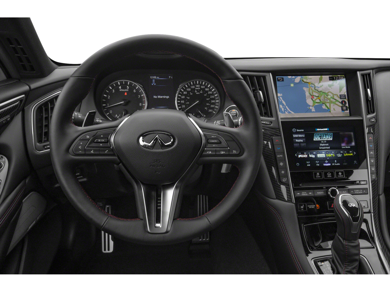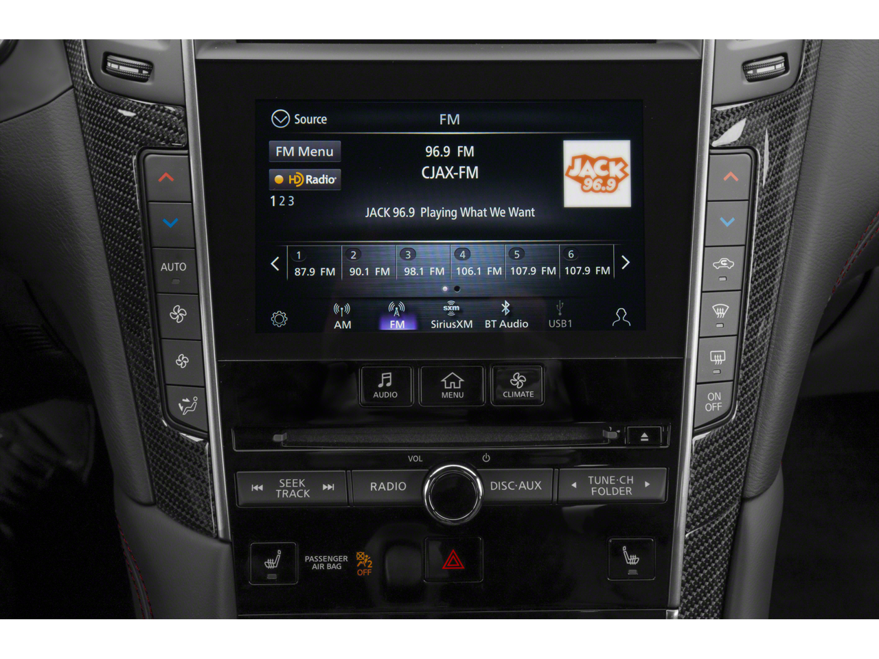 - Radio: INFINITI InTouch w/AM/FM/HD/CD/Navigation -inc: Bose performance series audio w/13 speakers and Bose Centerpoint simulated surround, navigation w/lane guidance, 3D building graphics, premium traffic and mapcare, Apple CarPlay w/Siri Eyes Free, Android Auto, INFINITI InTouch dual HD display system touchscreens (8" upper and 7" lower), voice recognition for audio and navigation functions, Bluetooth® and vehicle information, streaming audio via Bluetooth®, Bluetooth® hands-free phone system w/hands-free text messaging assistant, SiriusXM radio w/advanced audio features and a 3-month complimentary trial, SiriusXM Traffic w/3-month complimentary trial access to real-time traffic information, SiriusXM Travel Link w/3-month complimentary trial access to weather, fuel prices, stock prices, sports scores, movie listings and parking, 2 illuminated USB connection ports (1 type A and 1 type C) and auxiliary audio input