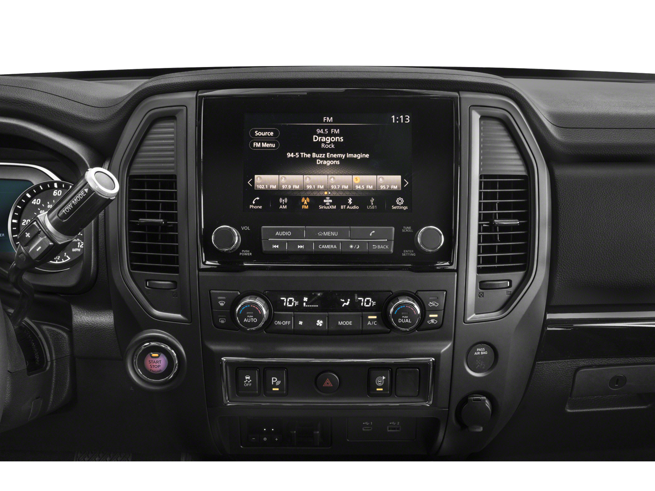 120V Outlet in Bed, 120V/12V Outlets In Back Of Center Console, 2 Illuminated USB-A Ports In Back Of Center Console, 3.69 Axle Ratio, 4-Pin/7-Pin Wiring Harness Connector (Rear Bumper), 4-Wheel Disc Brakes, 6 Speakers, ABS brakes, Air Conditioning, Alloy wheels, AM/FM radio: SiriusXM, Auto High-beam Headlights, Auto-Dimming Rear-View Mirror, Auto-Dimming Rearview Mirror w/UGDO, Bed Assist Grip, Black Front Bumper, Black Front Tow Hooks, Black Headliner & A-Pillar, Black Steering Wheel Finishers, Black Utility Mirror, Blind Spot Warning, Brake assist, Bumpers: chrome, Cloth Seat Trim w/Vinyl Bolsters, Dedicated Cell Phone Holder, Driver door bin, Driver vanity mirror, Dual front impact airbags, Dual front side impact airbags, Dual Illuminated Vanity Mirror Front Sun Visors, Dual Zone Automatic HVAC, Electronic Locking Tailgate, Electronic Stability Control, Flat Floor Function w/Tie Down Hooks, Front & Rear Parking Sensors, Front anti-roll bar, Front Center Armrest w/Storage, Front Door TITAN Emblem Delete, Front reading lights, Front Split Bench Seat (40/20/40), Front wheel independent suspension, Full LED Headlamp, Fully automatic headlights, Gloss Black Front Grille Surround, Heated door mirrors, Heated Front Captain's Chairs, Heated Manually Extendable Tow Mirrors, Illuminated entry, Intelligent Key System, Knee airbag, Leather-Wrapped Steering Wheel, LED Tailgate Area Illumination, LED Under Rail Bed Lighting, Low tire pressure warning, Midnight Sport Accessory (DISC), Mood Light, NissanConnect featuring Apple CarPlay and Android Auto, NissanConnect Services, Occupant sensing airbag, Outside temperature display, Overhead airbag, Overhead console, Overhead Console w/Sunglass Holder, Panic alarm, Passenger door bin, Passenger vanity mirror, Power door mirrors, Power Sliding Rear Window w/Defogger, Power steering, Power windows, Puddle Lamps, Radio data system, Radio: NissanConnect AM/FM, Rain Sensing Wipers, Rear anti-roll bar, Rear Bumper Step w/Electronic Tailgate Lock, Rear HVAC Vents, Rear Parking Sensors, Rear reading lights, Rear seat center armrest, Rear step bumper, Rear Utility Bed Step, Rear window defroster, Receiver Hitch, Remote Engine Start on Key Fob, Remote keyless entry, Security system, Special Liftgate Emblem Treatments, Speed control, Speed-sensing steering, Speed-Sensitive Wipers, Splash Guards, Split folding rear seat, Spray-On Bedliner, Steering wheel mounted audio controls, SV Convenience Package, SV Midnight Edition Package, SV Tow Package, SV Utility Package, Tachometer, Telescoping steering wheel, Tilt steering wheel, Traction control, Trailer Brake Controller, Trailer Light Check Function On Key Fob, Trip computer, Universal Garage Door Opener, Utilitrack System w/4 Tie-Down Cleats, Variably intermittent wipers, Voltmeter, Wheels: 18 x 8 Painted & Machined Alloy, Wheels: 20 x 8 Black, Wi-Fi Hotspot.