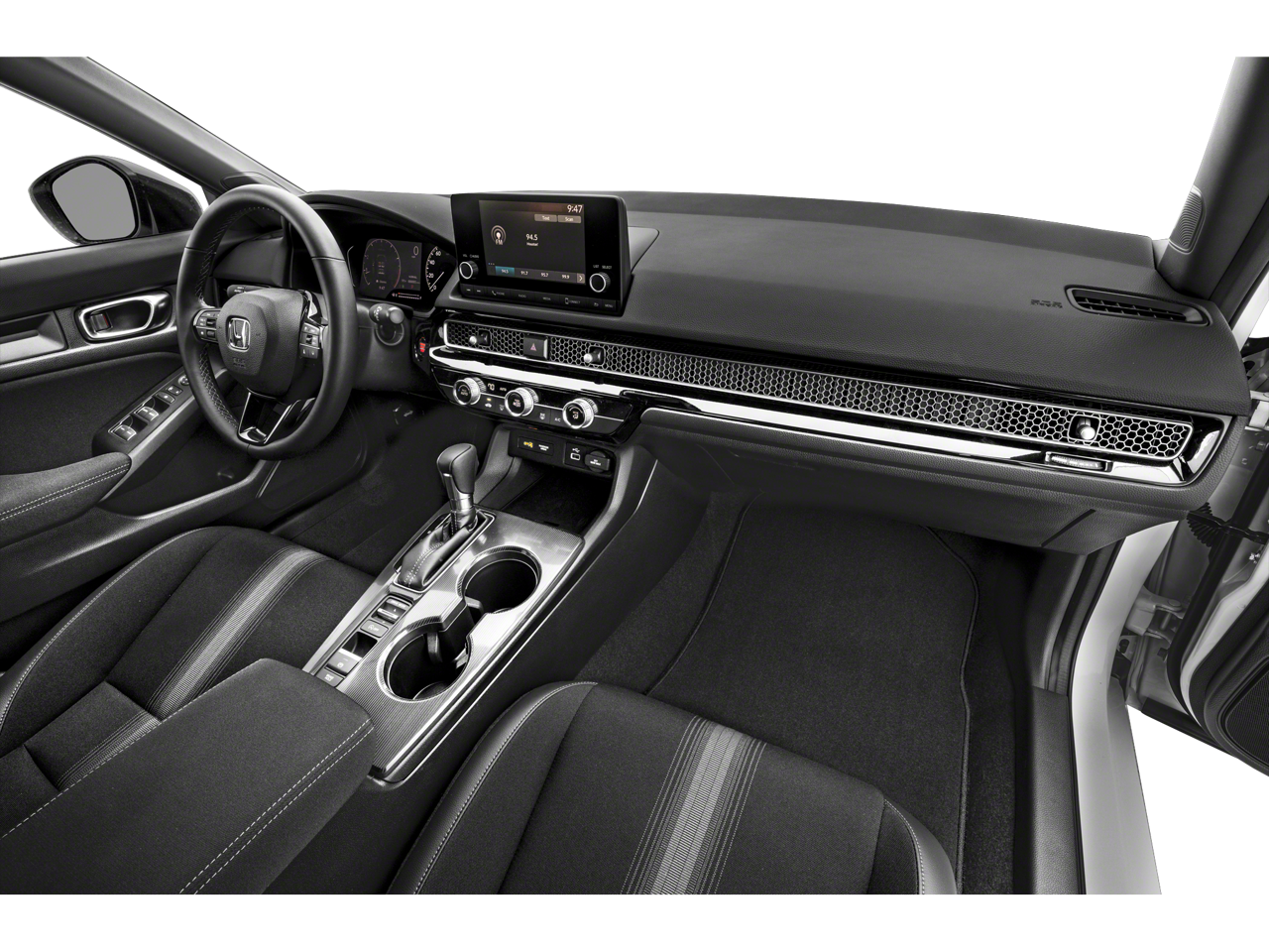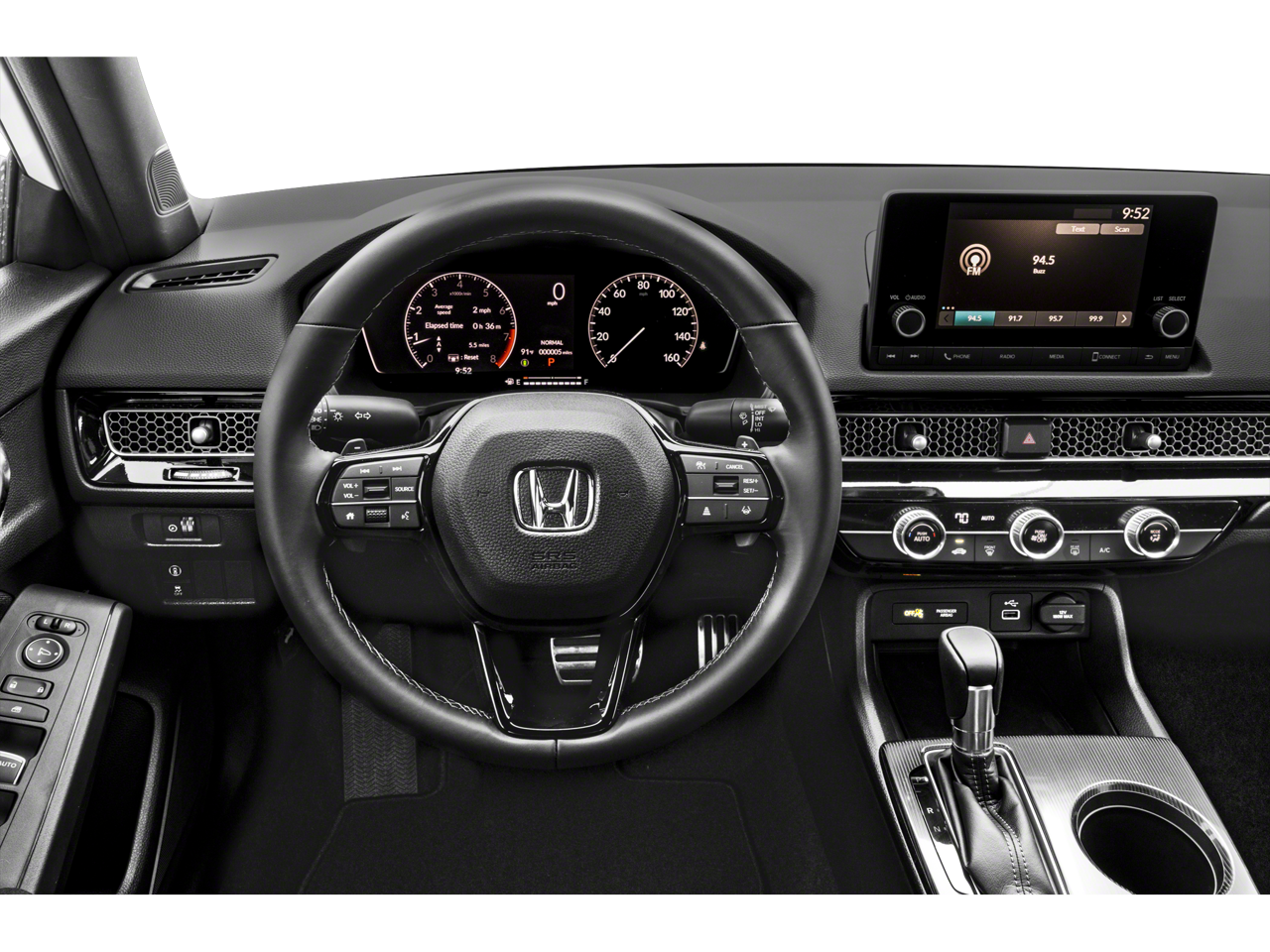 Gray Artificial Leather, 4-Wheel Disc Brakes, 8 Speakers, ABS brakes, Adaptive Cruise Control: Adaptive Cruise Control (ACC) with Low-Speed Follow, Air Conditioning, Alloy wheels, AM/FM radio, Apple CarPlay/Android Auto, Auto High-beam Headlights, Automatic temperature control, Brake assist, Bumpers: body-color, Cloth/Leatherette Seating Surfaces, Delay-off headlights, Driver door bin, Driver vanity mirror, Dual front impact airbags, Dual front side impact airbags, Electronic Stability Control, Emergency communication system: HondaLink, Exterior Parking Camera Rear, Four wheel independent suspension, Front anti-roll bar, Front Bucket Seats, Front Center Armrest, Front reading lights, Fully automatic headlights, Illuminated entry, Knee airbag, Leather Shift Knob, Leather steering wheel, Low tire pressure warning, Occupant sensing airbag, Outside temperature display, Overhead airbag, Panic alarm, Passenger door bin, Passenger vanity mirror, Power door mirrors, Power steering, Power windows, Radio data system, Radio: 180-Watt Audio System, Rear anti-roll bar, Rear side impact airbag, Rear window defroster, Remote keyless entry, Security system, Speed control, Speed-sensing steering, Steering wheel mounted audio controls, Tachometer, Telescoping steering wheel, Tilt steering wheel, Traction control, Trip computer, Wheels: 18 Gloss Black Alloy, Gray Artificial Leather.