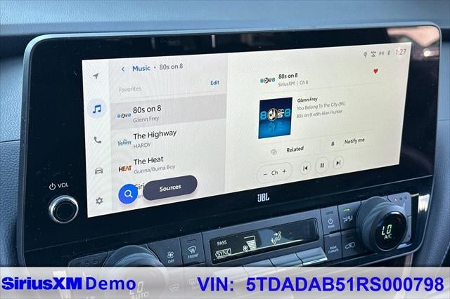 2.4L 4-Cylinder VVT-i, 11 Speakers, 20 Aluminum Alloy Wheels, 3rd row seats: split-bench, 4-Wheel Disc Brakes, ABS brakes, Air Conditioning, Alloy wheels, AM/FM radio: SiriusXM, Apple CarPlay/Android Auto, Auto High-beam Headlights, Auto-dimming Rear-View mirror, Automatic temperature control, Brake assist, Bumpers: body-color, Delay-off headlights, Driver door bin, Driver vanity mirror, Dual front impact airbags, Dual front side impact airbags, Electronic Stability Control, Emergency communication system: Safety Connect (up to 10-year trial subscription), Exterior Parking Camera Rear, Four wheel independent suspension, Front anti-roll bar, Front Bucket Seats, Front Center Armrest, Front dual zone A/C, Front fog lights, Front reading lights, Fully automatic headlights, Garage door transmitter: HomeLink, Heated & Ventilated Front Seats w/Memory, Heated door mirrors, Heated front seats, Heated rear seats, Heated steering wheel, Illuminated entry, Knee airbag, Leather Shift Knob, Leather steering wheel, Low tire pressure warning, Memory seat, Navigation system: Drive Connect Cloud Navigation (1-year trial subscription), Occupant sensing airbag, Outside temperature display, Overhead airbag, Overhead console, Panic alarm, Passenger door bin, Passenger vanity mirror, Power door mirrors, Power driver seat, Power Liftgate, Power passenger seat, Power steering, Power windows, Radio: 12.3 Toyota Audio Multimedia w/JBL Premium, Rain sensing wipers, Rear air conditioning, Rear anti-roll bar, Rear reading lights, Rear window defroster, Rear window wiper, Reclining 3rd row seat, Remote keyless entry, Security system, Speed control, Speed-sensing steering, Split folding rear seat, Spoiler, Steering wheel mounted audio controls, TBD Axle Ratio, Telescoping steering wheel, Tilt steering wheel, Traction control, Trip computer, Turn signal indicator mirrors, Ultrasuede/Leather Seat Trim, Variably intermittent wipers, Ventilated front seats, 2.4L 4-Cylinder VVT-i.